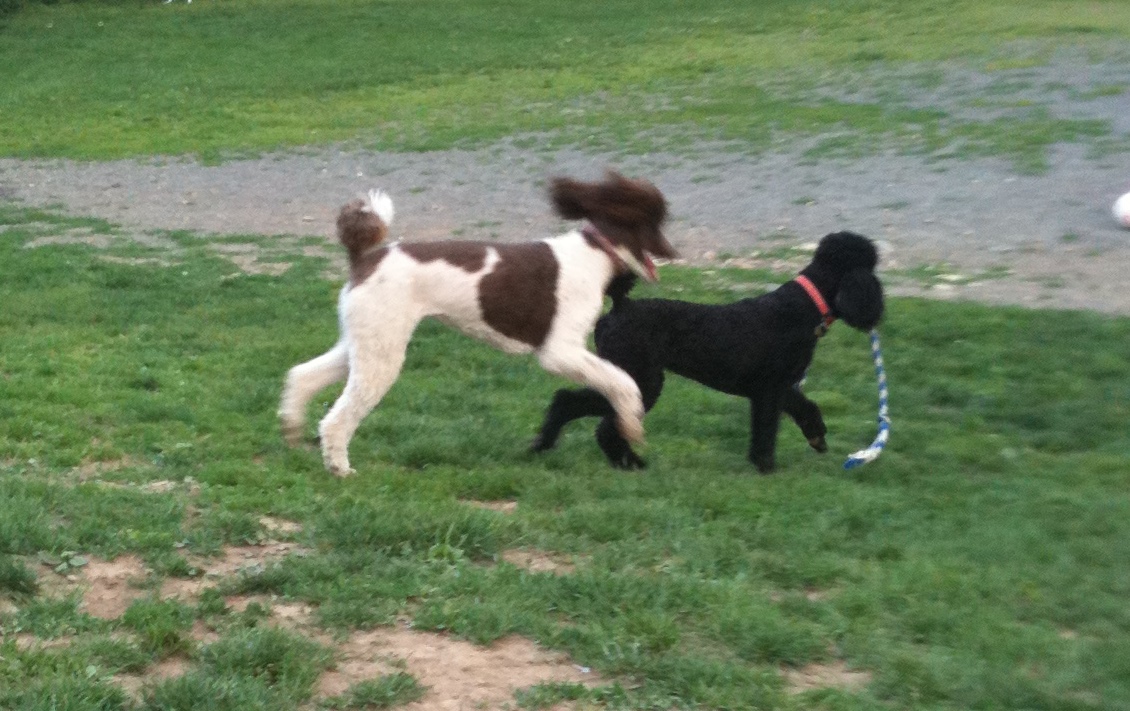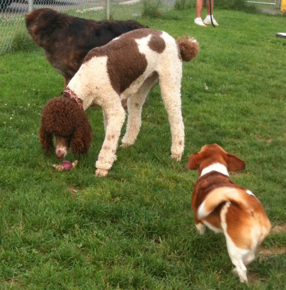 Scraps and Rags were playing by alone then Darby arrived, followed by Ollie and Grace. Oh well, I had no pictures to take so I figured there would be no blog posting tonight. Then a new dog to me and the blog came, Lily the brown-patched poodle? I therefore wanted to get some pictures so I broke out the iPhone to capture a few moments. That is my excuse for the bad quality pictures and no link to an external web album with additional photos. Until next time when I’ll have full battery power and better pictures.