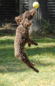 At 11:30 we went to the small dog park to throw a ball around with Scraps. This is where we met Baci, a really cute brown toy poodle weighing in at 6 pounds. Baci loved to run after and jump for his tennis ball.